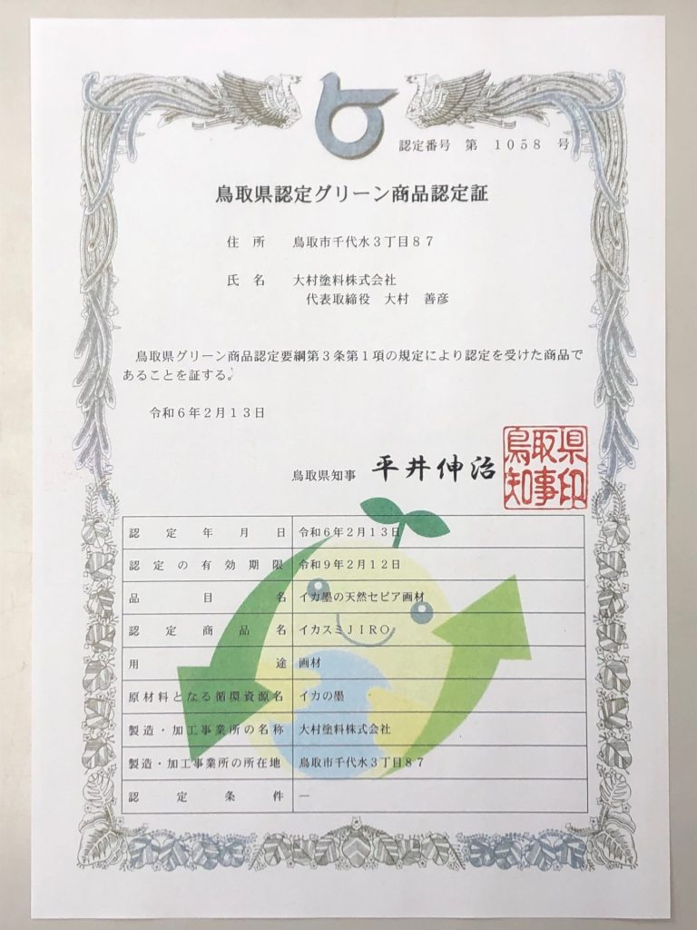 自社開発の天然イカスミ顔料「イカスミJIRO」が2月13日に、鳥取県認定グリーン商品に認定されました。